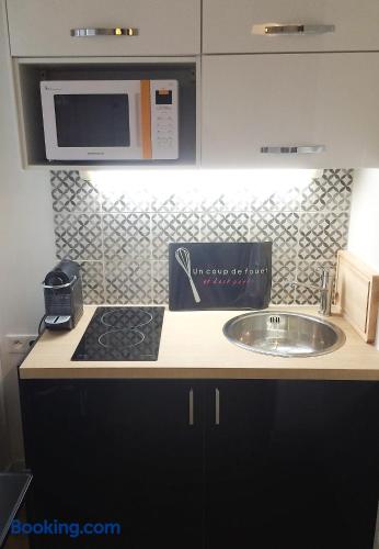 This 19m² space, perfect for two, is entirely at your disposal. The apartment includes a fully equipped kitchen with a dining area, a separate bathroom with shower and toilet. The bedroom, featuring a comfortable bed (spring mattress and soft topper), is located upstairs, accessible via a charming spiral staircase. The apartment is richly equipped for your comfort: Microwave/grill Induction hob Various kitchen utensils Bosch refrigerator Toaster Nespresso coffee machine (capsules included) LG washer-dryer Iron and ironing board Wi-Fi connection Latest generation Samsung TV (USB, Wi-Fi, DLNA, apps, games...) Vacuum cleaner To make your stay even more pleasant and to minimize your luggage, you will also find at your disposal: Soap, shower gel, and shampoo Bath towels Hairdryer Bed linen Extra blankets for those who are cold The entrance to the apartment, located on the ground floor after the building's secure door, makes transporting your luggage very easy.